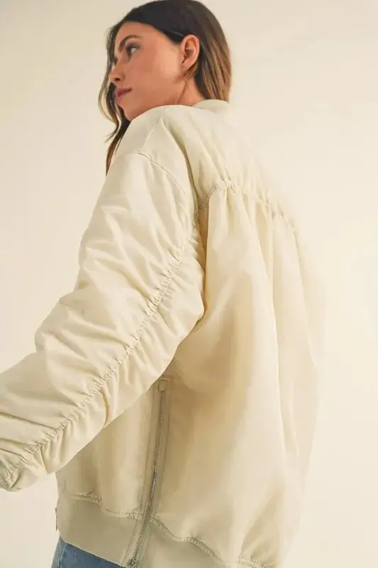 The Back Ruched Utility Bomber Jacket combines fashion and functionality with a utility-inspired design and feminine ruched detailing. It’s versatile and on-trend, perfect for adding a modern edge to any outfit.