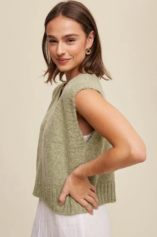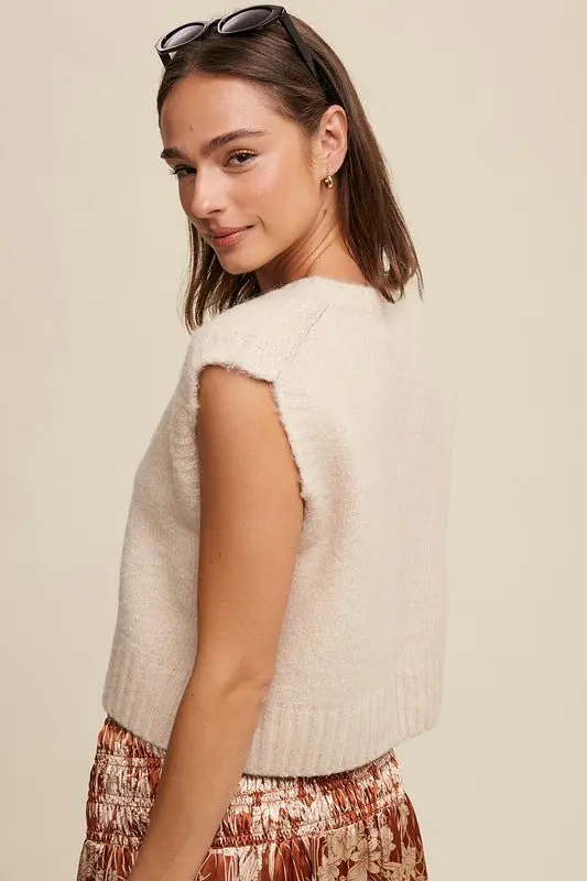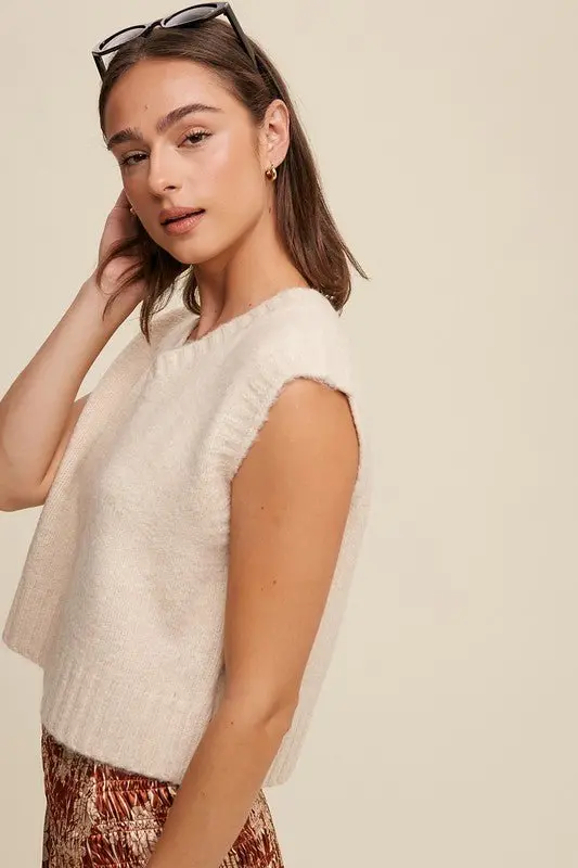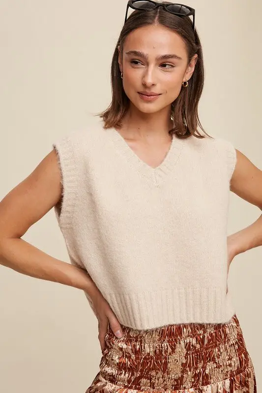 The Soft Touch Cropped Knit Vest effortlessly combines style and comfort with its V-neck design and stretchy fabric. The ribbed detailing on the neck, sleeve openings, and hem adds a subtle texture, enhancing the overall aesthetic. This versatile piece is perfect for various occasions, offering a trendy and snug fit that complements any outfit.