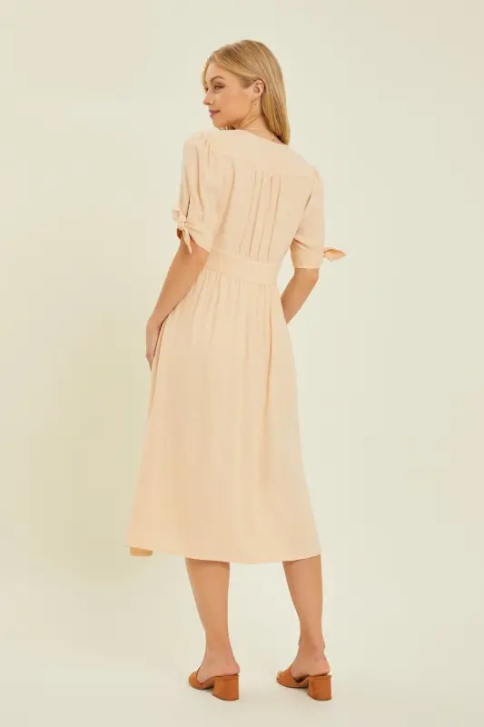 The Textured Linen V-Neck Button-Down Midi Dress is a timeless and stylish option for any occasion. Made from breezy textured linen fabric, it features a flattering V-neckline and button-down front for a comfortable and elegant look. The midi length adds versatility to your wardrobe, perfect for dressing up with heels or going for a casual look with sandals. Elevate your summer style with this effortlessly chic dress.