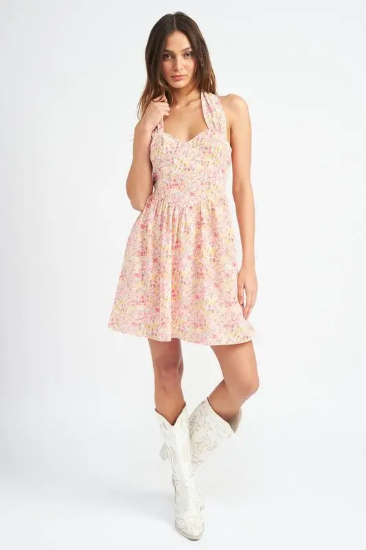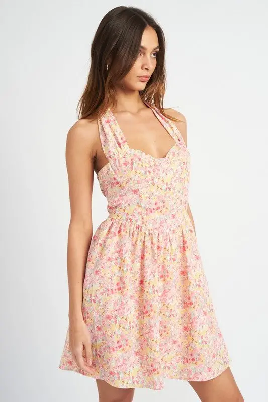 Get ready to bloom in this floral bustier halter neck mini dress! Perfect for concerts, vacations, or just soaking up the summer vibes. Stand out in style and show off your fun-loving personality.
