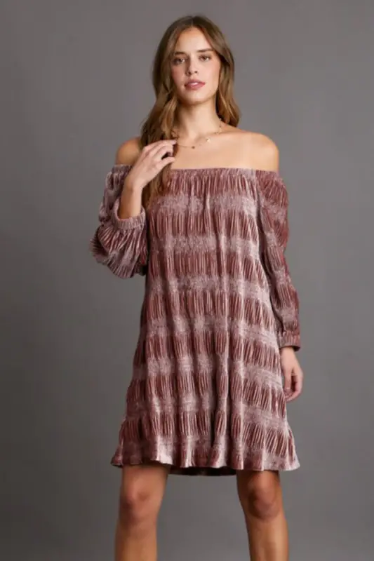 The off-shoulder velvet mini dress is perfect for any occasion. Its design is both glamorous and playful.