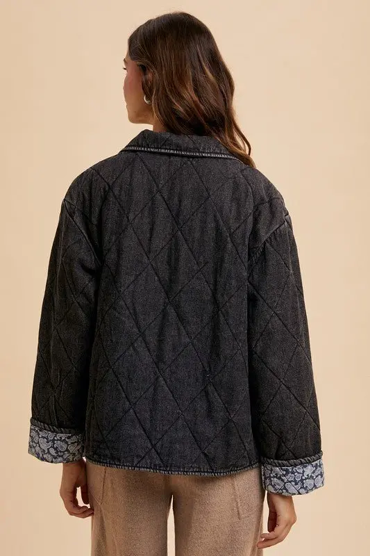 Quilted denim jacket with snap-down closures and colorful lining. Versatile and trendy with a unique look. Perfect for staying warm and stylish all year long.