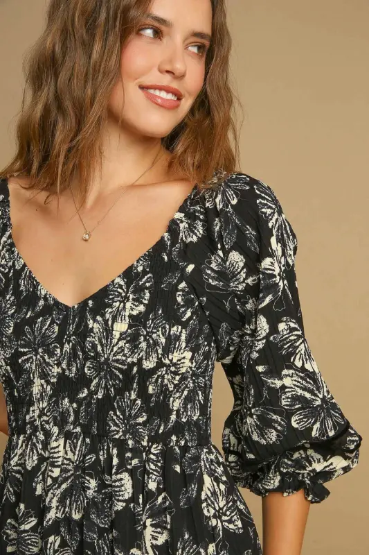 This Ruffle Hem Floral Midi Dress is elegant and versatile with a floral print and flattering V-neckline, perfect for any occasion. Smocking in the back for a comfortable and flattering fit. Ruffle hem detail adds a playful touch. Feel confident and beautiful in this charming piece.