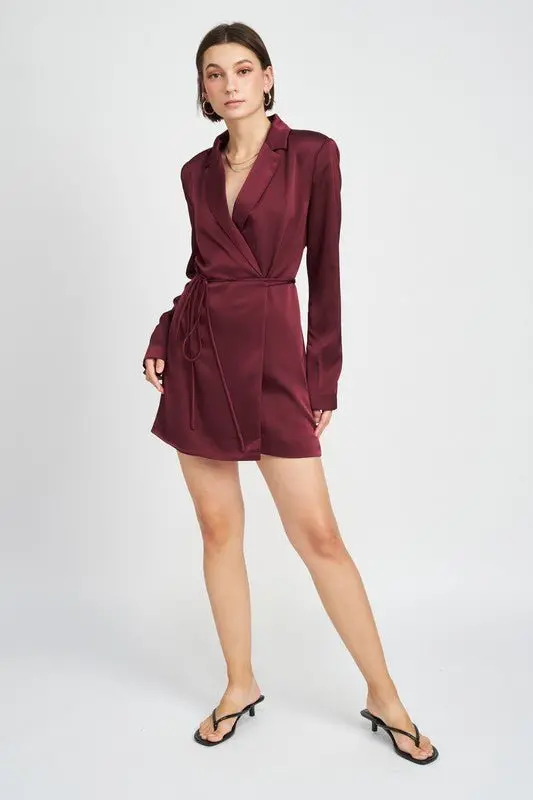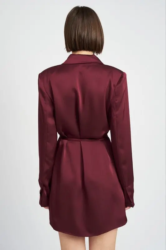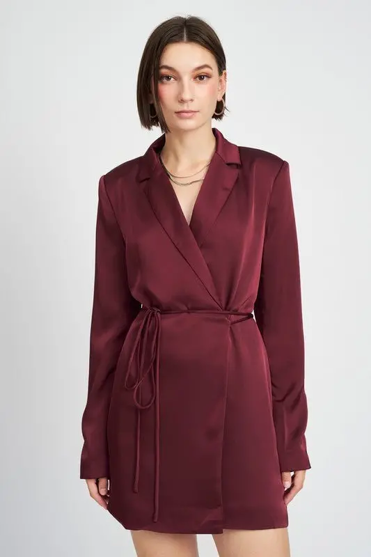 Satin blazer mini dress with a collar and tie string detail at waist. This dress is perfect for work and play! Fully lined.