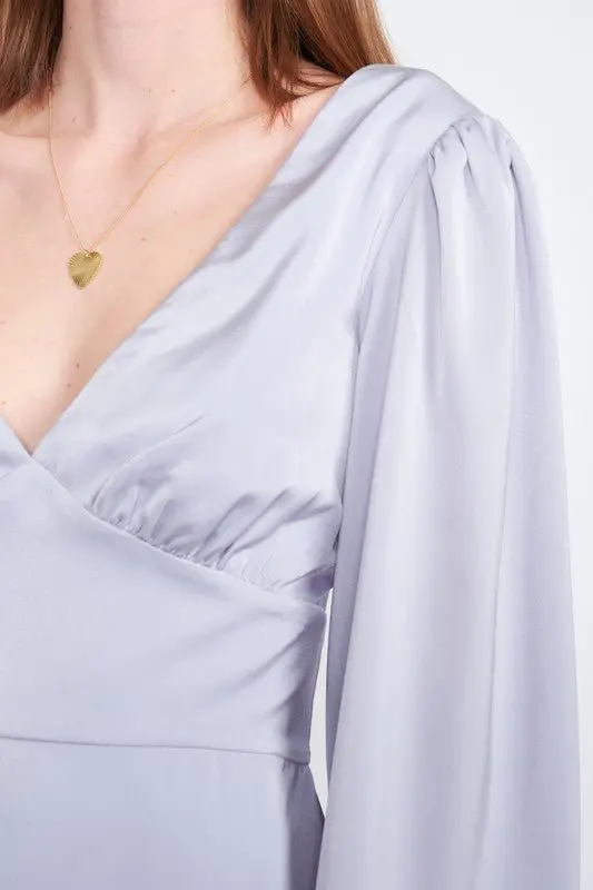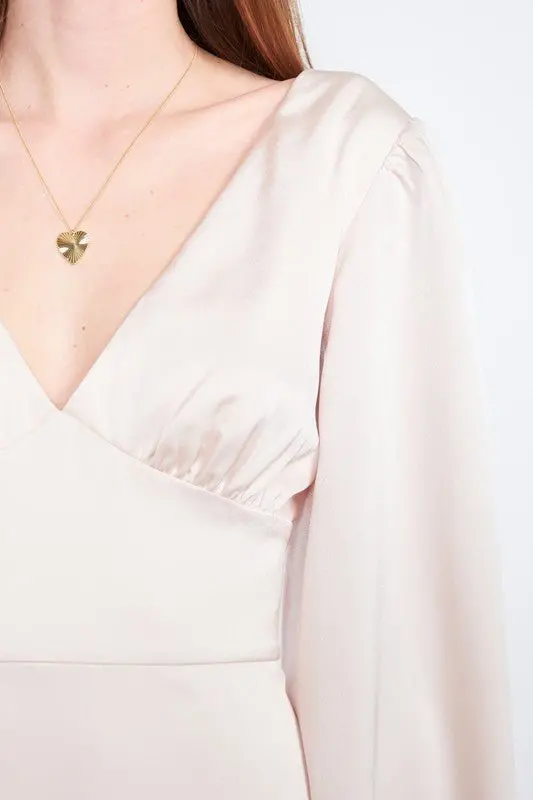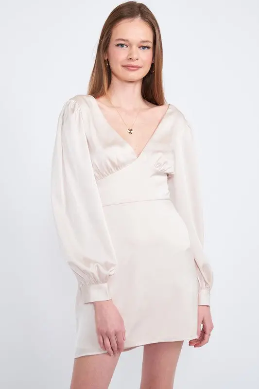 Get ready to steal the spotlight in our Satin V Neck Mini Dress! Made with luxurious satin fabric, this dress features a trendy v neck, long sleeves, and a playful cutout with a tie at the back. Finished with a zipper closure, it’s perfect for any occasion.