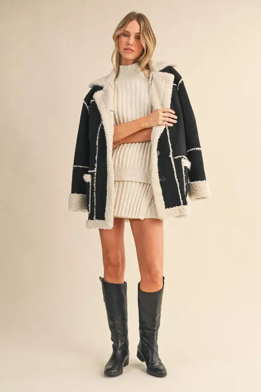 Black suede and sherpa combo coat that’s warm, chic, and timeless. Features a soft sherpa lining, sleek suede exterior, and practical front pockets. Perfect for layering with everything in your wardrobe.